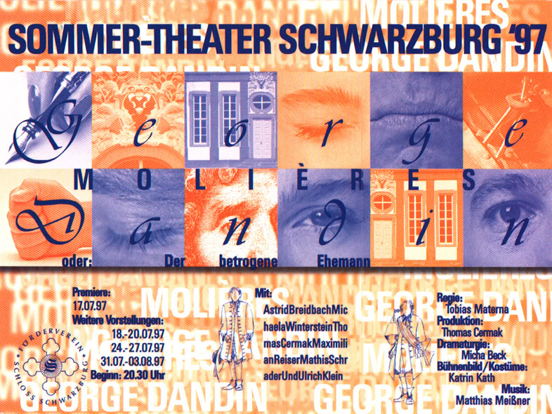 „George Dandin“, die erste von drei Inszenierungen für Schwarzburg stand unter keinem guten Stern. Die Premiere fiel ins Wasser und wurde ersatzweise im Kaisersaal ohne Bühnenbild improvisiert. Selbige war aber ein großer Erfolg. Von Anfang an war mir eine klassische Stück-auswahl wichtig. Mit dem Ziel, die Besucher von Schwarzburg nicht nur zu unterhalten, sondern auch zu fordern. Schwarzburg (die Perle Thüringens) hatte zu dieser Zeit ca. 1000 Besucher pro Einwohner jährlich, die meist nur für eine Nacht blieben. Für ein Sommertheater die idealen Voraus-setzungen. Eine Spielzeitverlängerung auf drei Sommermonate, konnte ich vor Ort leider nie umsetzen. In dieser Inszenierung von Tobias Materna habe ich die Titelrolle gespielt und dieses Sommertheater produziert.