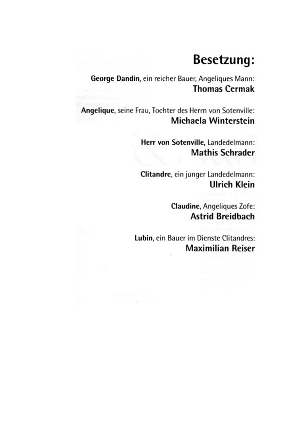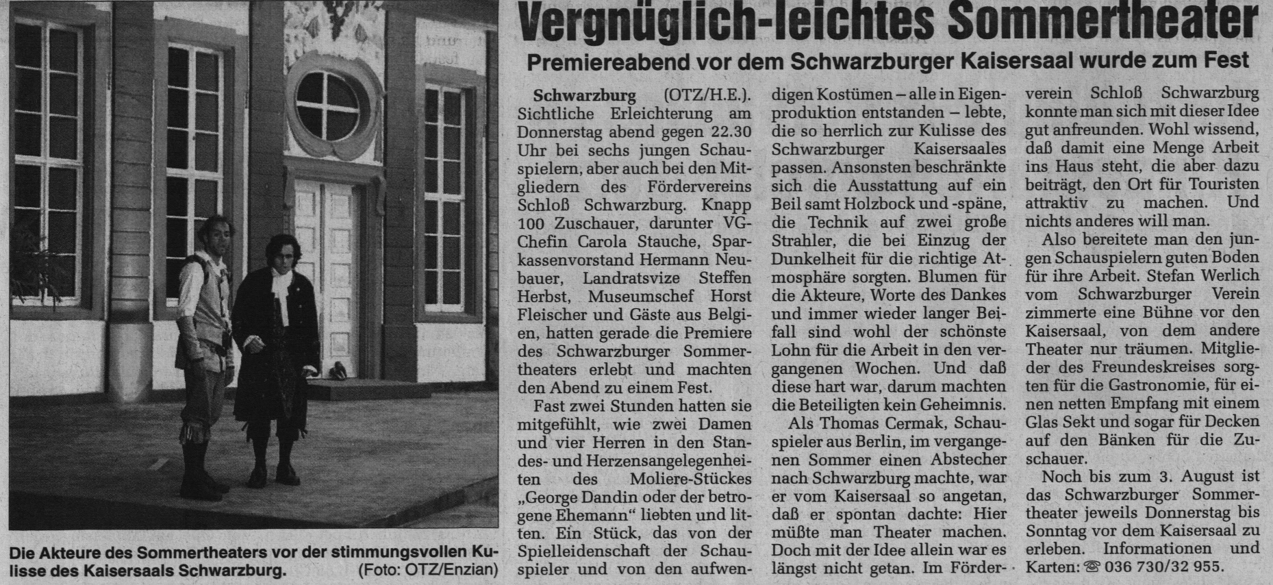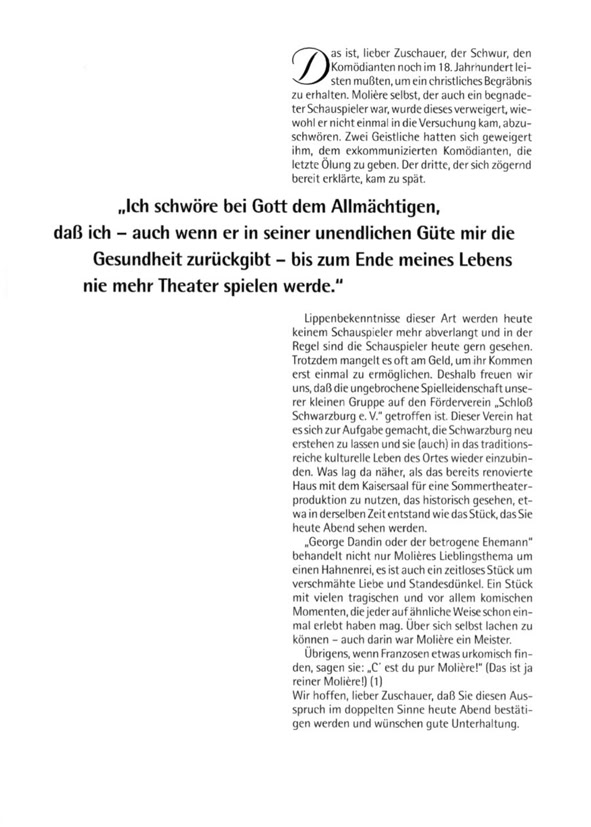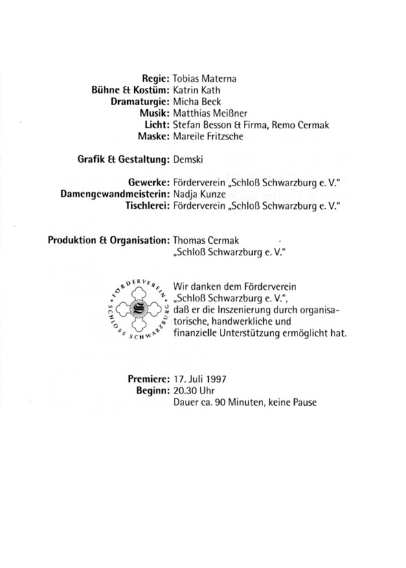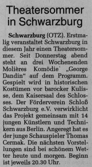 „George Dandin“, die erste von drei Inszenierungen für Schwarzburg stand unter keinem guten Stern. Die Premiere fiel ins Wasser und wurde ersatzweise im Kaisersaal ohne Bühnenbild improvisiert. Selbige war aber ein großer Erfolg. Von Anfang an war mir eine klassische Stück-auswahl wichtig. Mit dem Ziel, die Besucher von Schwarzburg nicht nur zu unterhalten, sondern auch zu fordern. Schwarzburg (die Perle Thüringens) hatte zu dieser Zeit ca. 1000 Besucher pro Einwohner jährlich, die meist nur für eine Nacht blieben. Für ein Sommertheater die idealen Voraus-setzungen. Eine Spielzeitverlängerung auf drei Sommermonate, konnte ich vor Ort leider nie umsetzen. In dieser Inszenierung von Tobias Materna habe ich die Titelrolle gespielt und dieses Sommertheater produziert.